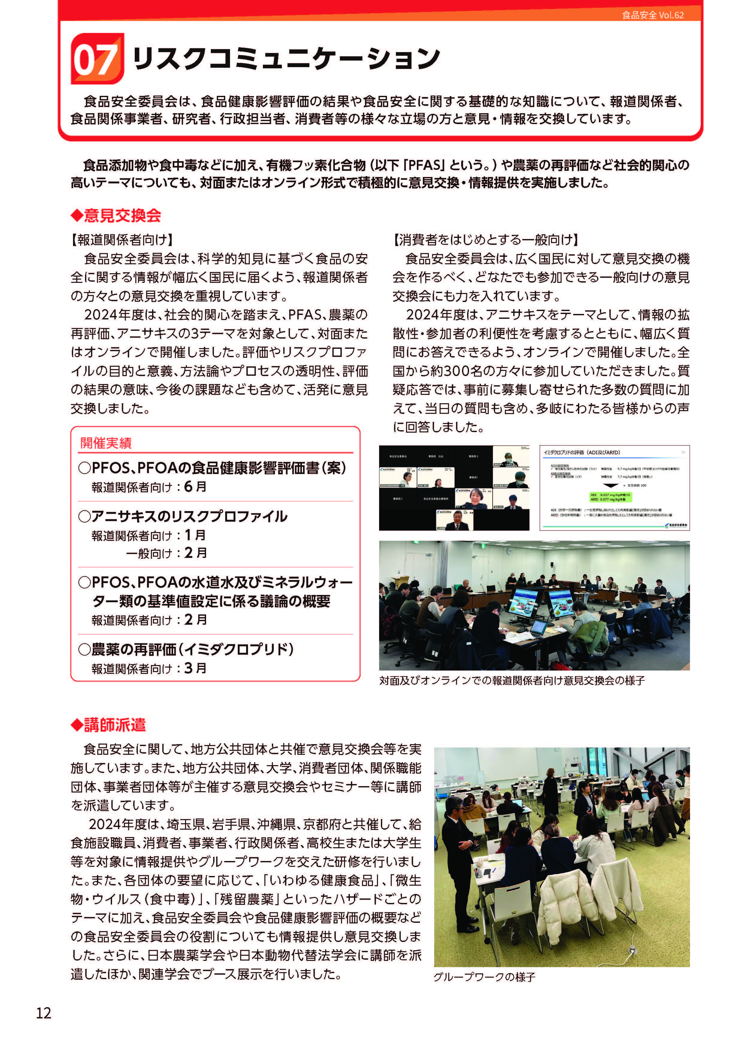 食品安全委員会は、食品健康影響評価の結果や食品安全に関する基礎的な知識について、報道関係者、食品関係事業者、研究者、行政担当者、消費者等の様々な立場の方と意見・情報を交換しています。
